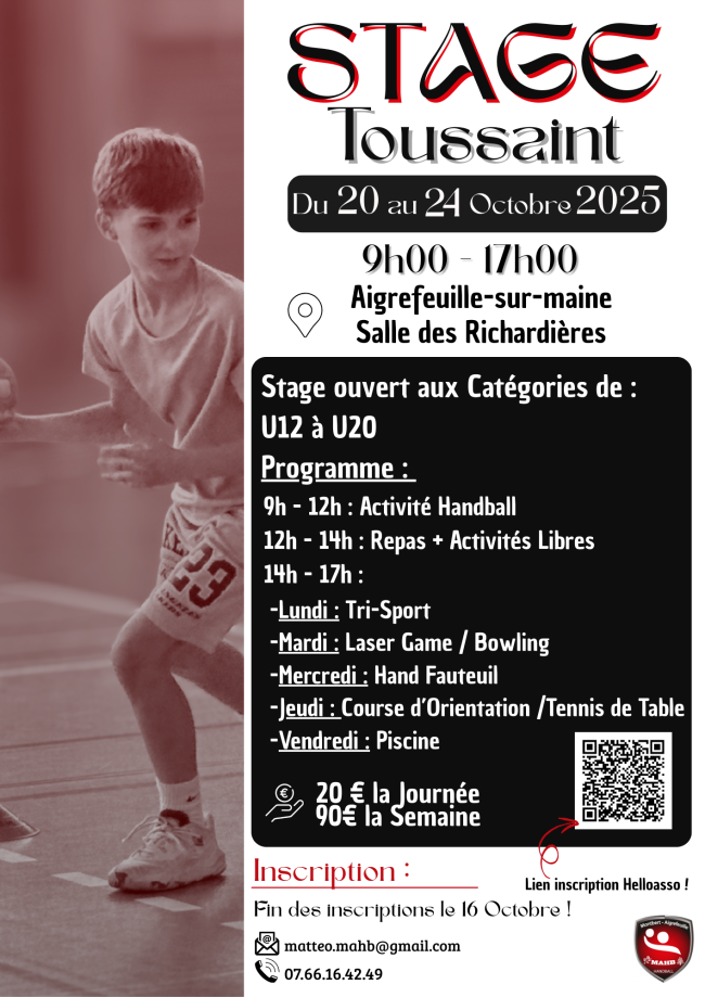 Le MAHB vous propose un stage pendant les vacances de la Toussaint. Ce stage est réservé aux adhérents du club qui évoluent de U12 au U20. Ces temps seront encadrés par Mattéo Merceron (Entraîneur diplômé).